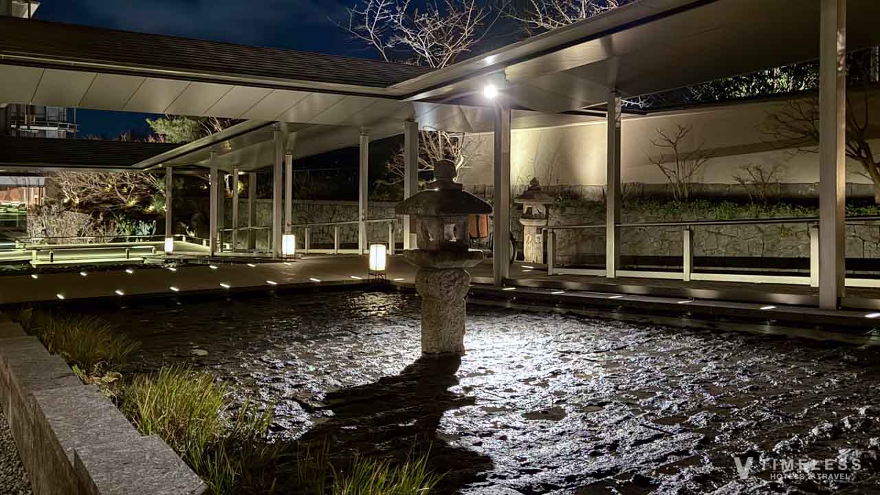 エントランスを抜け、外界とを隔てる回廊へ足を踏み入れた瞬間。耳に届く清らかな水の流れに、日々の喧騒で強張っていた心が静かに解きほぐされていくのを感じます。館内には、京都の伝統美と現代の洗練が融合した、静謐なる空間が広がっています。